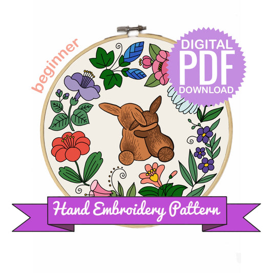 2 Bunnies in Fairy Floral Wreath Hand Embroidery Pattern