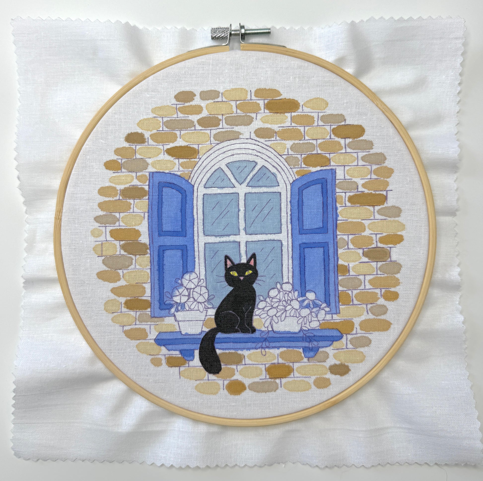 The pattern is transferred using a heating erasable gel pen and watercolor paints.